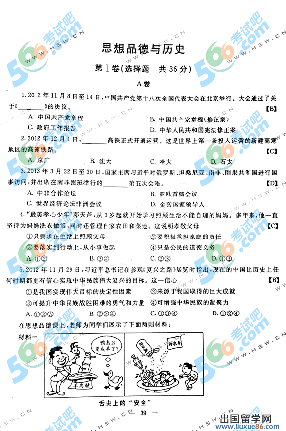2013年中考已经结束,学子们一定十分关注成绩线的指标,小编也是和大家一样。为了能给大家在2014年中考考试考出好成绩,小编已在留学群分享2013年汉中中考思想品德及历史试题及答案,这是陕西省2013年统一考试试卷。(CTRL+D即可收藏)