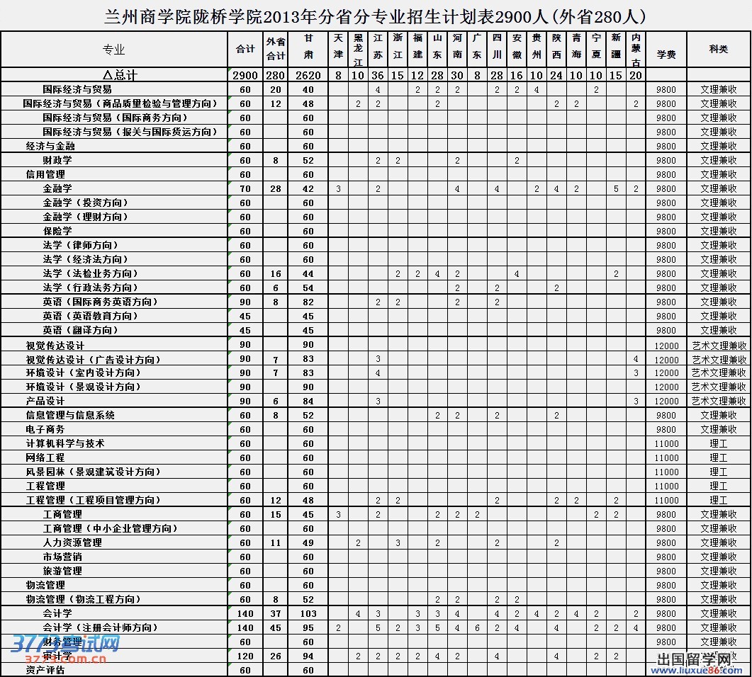 2013年高校招生信息:兰州商学院陇桥学院招生计划表