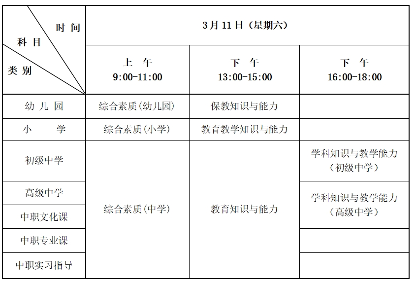 (四)全国统一考试时间为3月11日,各类别考试科目与时间安排如下: