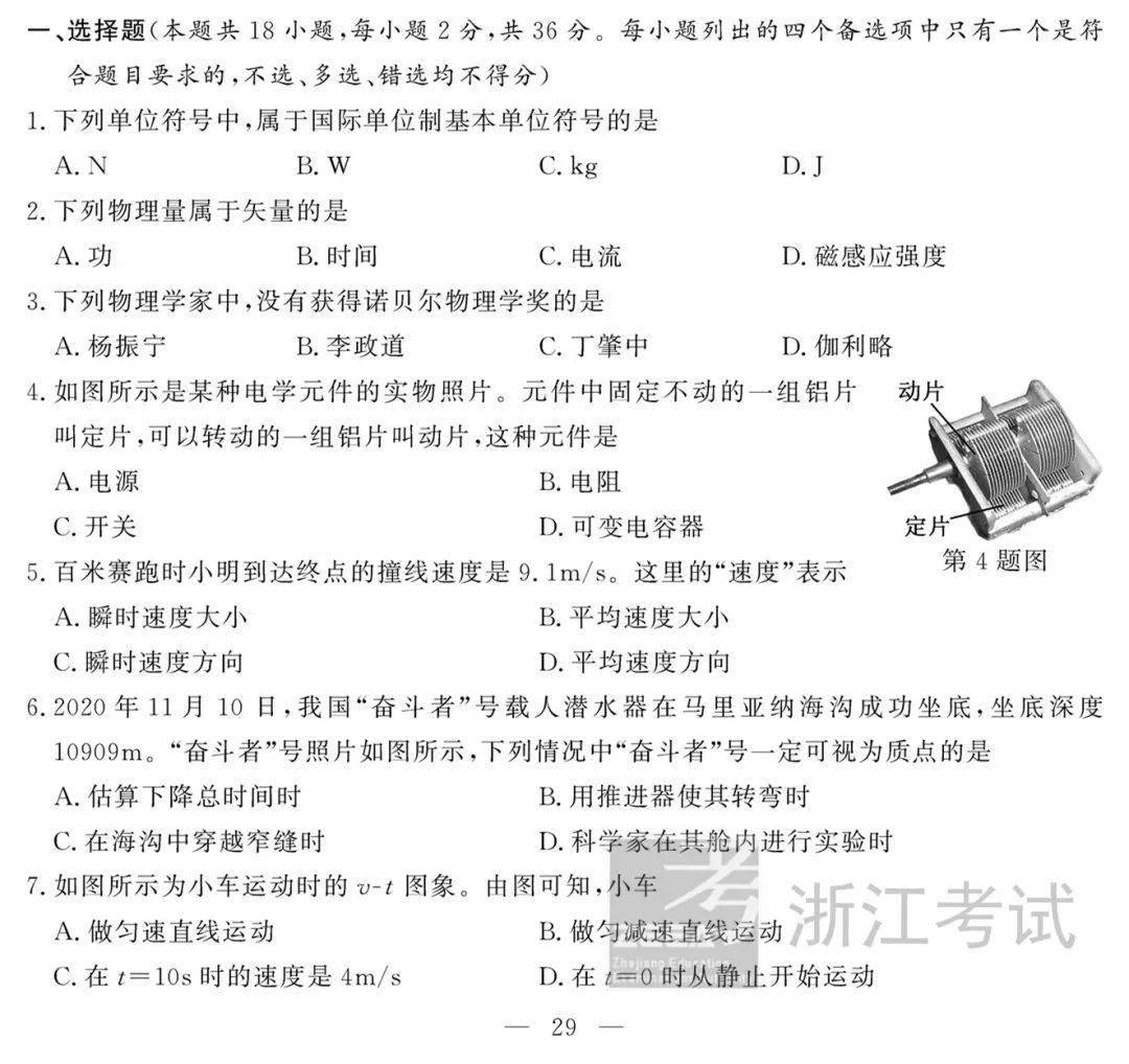 2021年1月浙江普通高中学考试题和参考答案(物理)