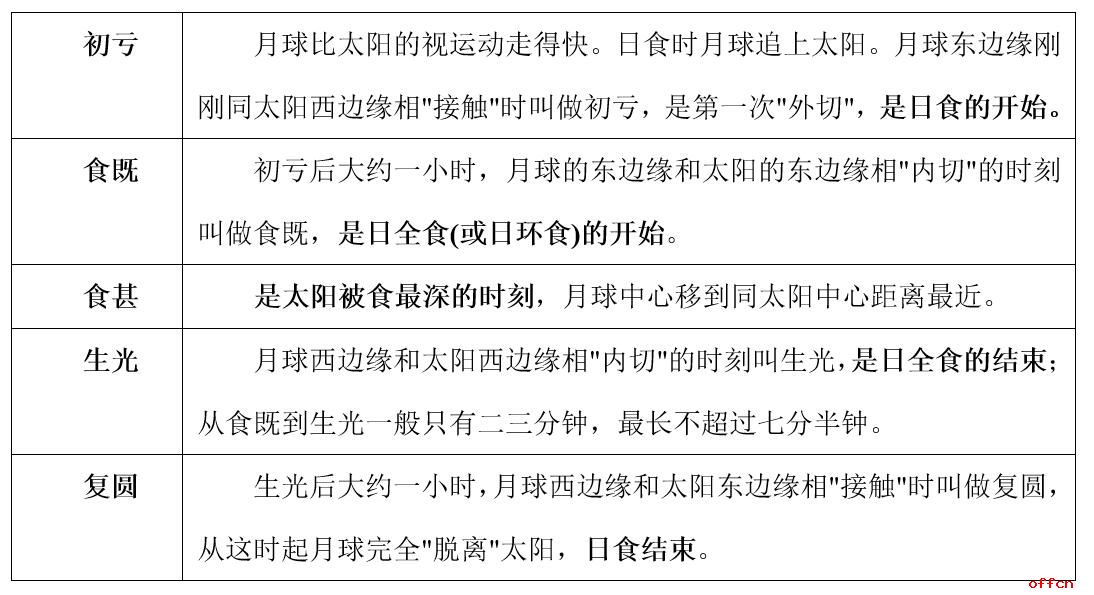 (2)日全食与日环食都有上述5个过程,而日偏食只有初亏、食甚、复圆3个过程,没有食既、生光。