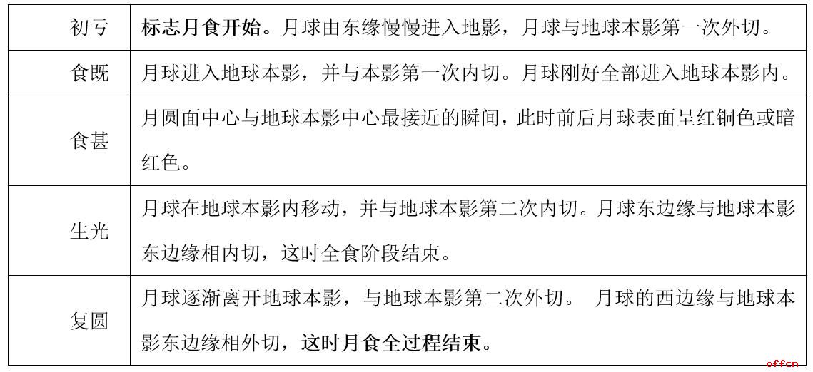 4.发生过程:正式的月食的过程分为初亏、食既、食甚、生光、复圆五个阶段。