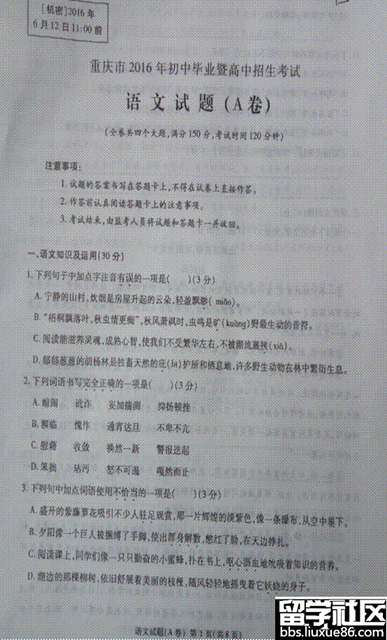 以下是留学群小编为大家带来的2016重庆中考语文(B卷)试题及答案,详细内容如下,希望能对大家有所帮助!预祝各位考生都能取得好的成绩!