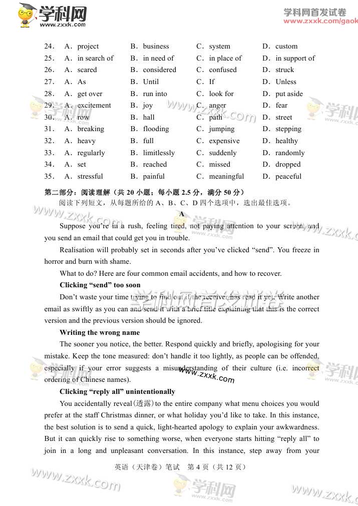 高考各科真题及答案已经陆续公布,留学群高考频道为大家提供2017天津高考英语真题及答案,希望能帮助大家顺利估分。更多高考分数线、高考成绩查询、高考志愿填报、高考录取查询信息等信息请关注我们网站的更新!