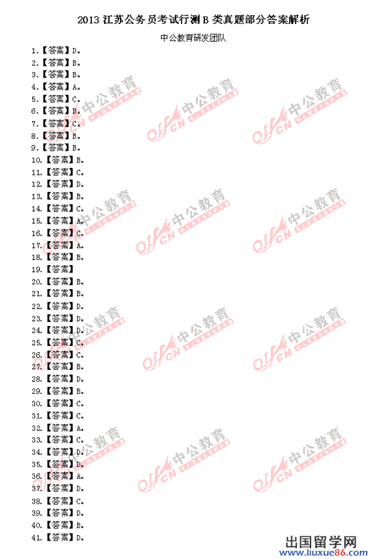 2013年03月24日,本文由留学群公务员考试真题编收集整理,感谢您阅读《公务员真题:2013年江苏省公务员考试行测B卷真题答案》.公务员考试工作已经于3月17日结束,留学群公务员频道(www.liuxuequn.com/gongwuyuan)第一时间为您发布公务员考试行测真题及答案,欢迎收藏本网站。