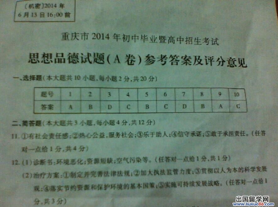 以下是留学群中考频道第一时间为您提供的2014重庆中考政治真题及答案(A卷),希望对您2014年中考有所帮助!