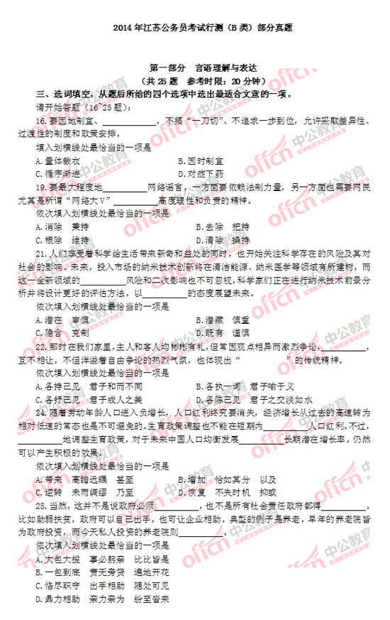 2014江苏公务员考试真题已经公布,留学群公务员栏目特为大家提供了江苏省2014公务员行测真题B卷,想查阅更多省份的公务员考试真题吗?欢迎大家收藏留学群公务员考试网,随时关注公务员考试最新信息。