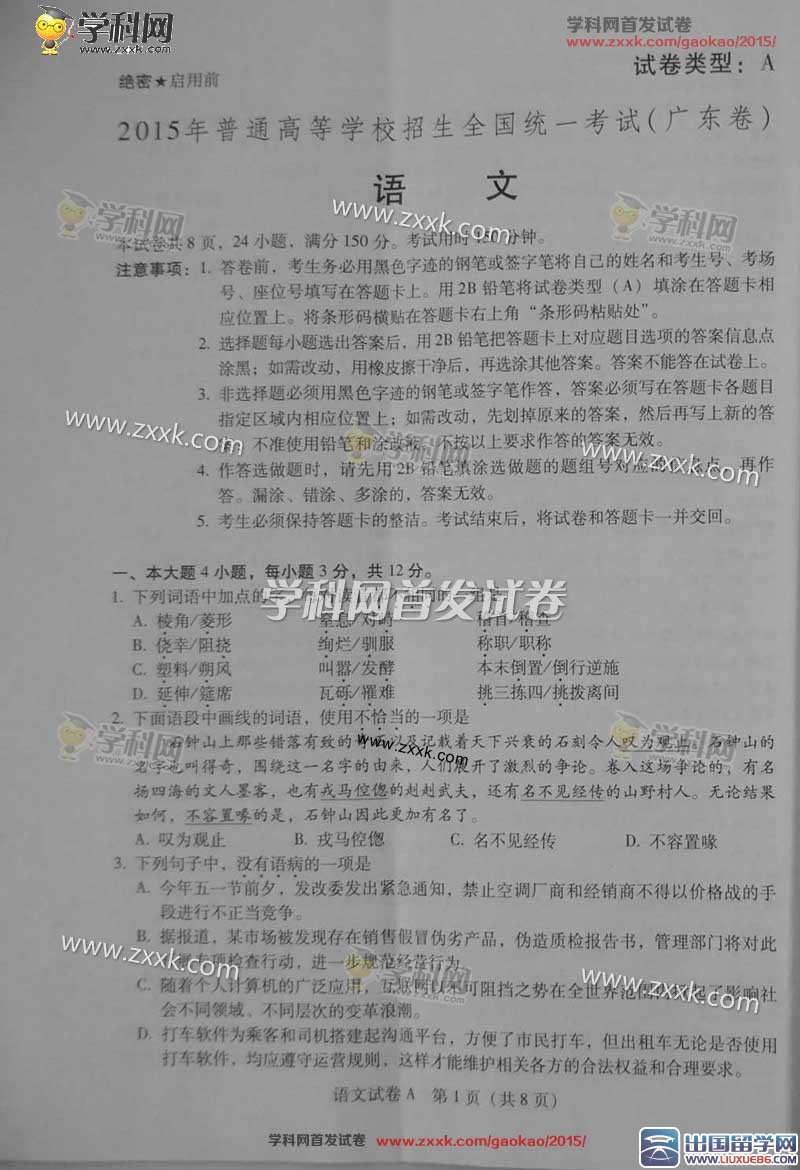 高考对于有的同学来说是一个转折,是一个新的起点;对于某些同学来说则更像是一堵墙,一道阻碍你继续前进的坎,只有用积极的心态面对它,眼前的阻碍或者屏障便会成为帮助你走向成功的垫脚石。如果你迫不及待想要知道答案,留学群高考频道非常愿意帮助你,也希望最后的结果能如你所愿。留学群高考频道小编紧密关注2015广东高考语文真题及答案,只要高考真题及答案公布,你便可以在此页面的头条看到。如果你需要的真题和答案还未显示,你可以按ctrl+F5刷新页面,欢迎广大考生以及家长实时关注,更多高考科目真题及答案会在考后第一时间公布,建议您收藏本网站(按ctrl+D即可)。最后祝同学们考取好的成绩。