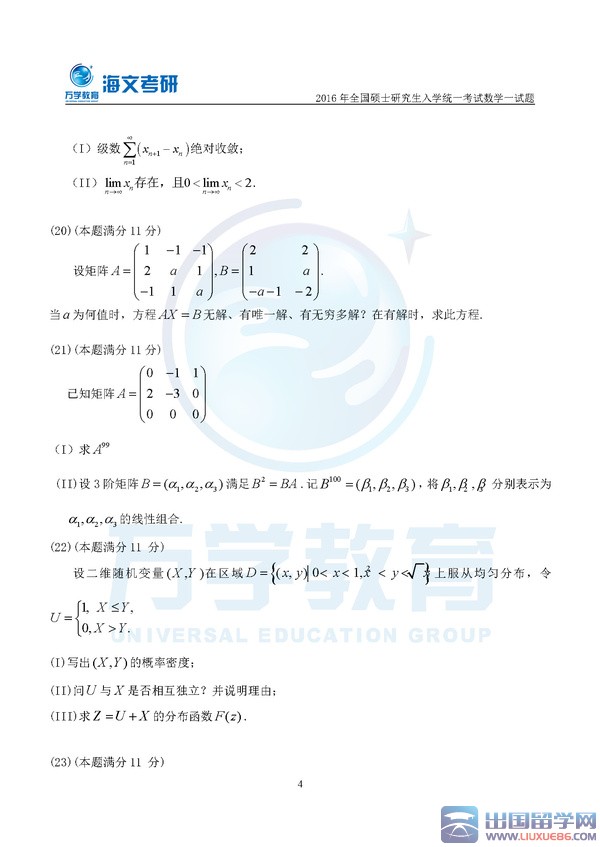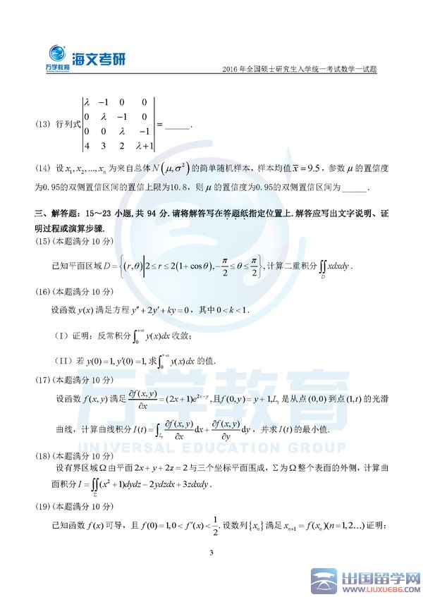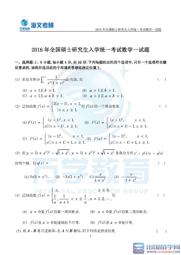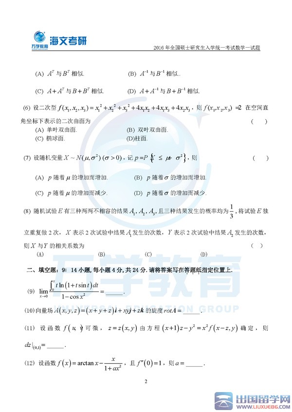 留学群2016考研数学一真题