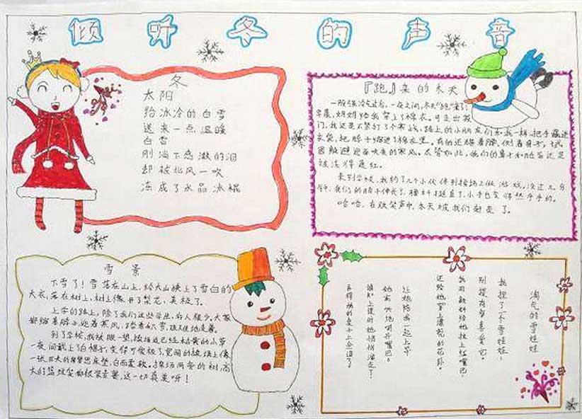 秋天过去了,寒冷的冬天又将重新降临大地,让我们的世界银装素裹,关于冬天的手抄报要怎样绘制呢?下面是由留学群小编为大家整理的“冬天手抄报简单又漂亮”,仅供参考,欢迎大家阅读。