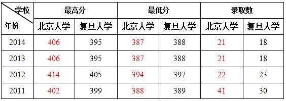 上表中,近4年复旦大学在江苏的最低录取分数连续超过北大,除去2012年录取人数超过北大1个名额,其他年份录取人数均低于北大。最低分数线更高且录取人数少,难怪复旦大学的录取难度比北大还大。