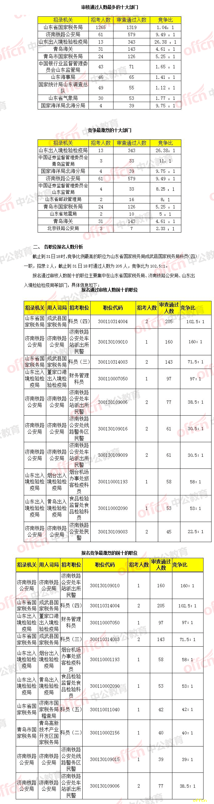 截止到31日18时,通过审核人数前三位的部门依次是:山东省国家税务局、济南铁路公安局、山东出入境检验检疫局,三部门通过审核总人数达2241人,占通过审核总人数的75.7%。