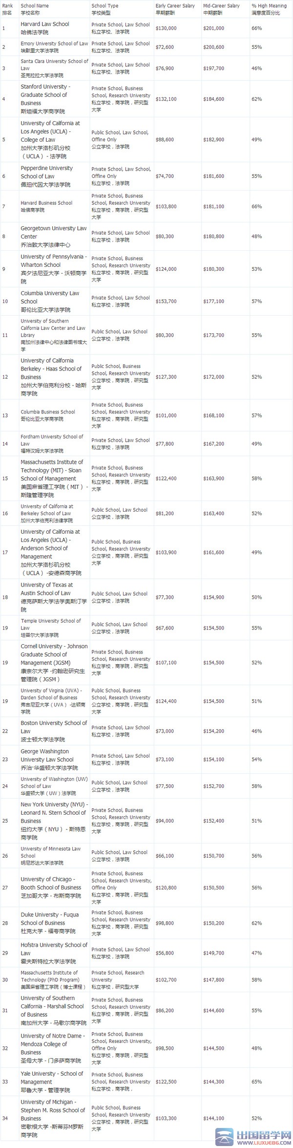 下面是Pay Scale首次公布的美国研究生毕业生薪酬排行榜,榜单囊括美国大学MBA专业,法学博士(JD),硕士以及博士毕业生薪酬排名,该排名的调查数据来自美国全国的数百所大学。
