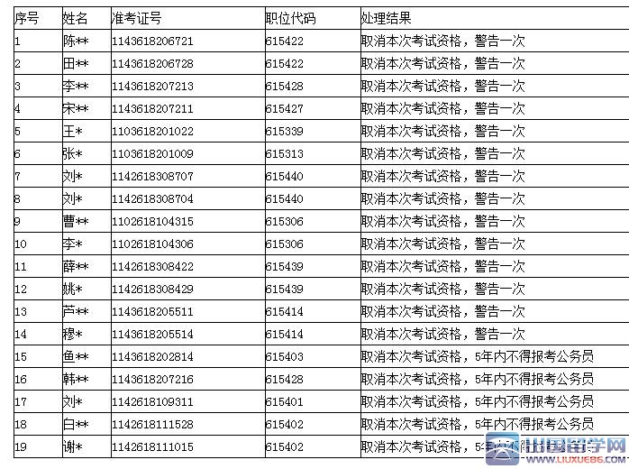 同时,按照中央公务员主管部门的要求,经专门机构鉴定,对《行政职业能力测验》答题信息属同考场作弊情形的陈**等14名考生(详见附表),予以“取消本次考试资格,警告一次”的处理;对《行政职业能力测验》答题信息属于集团型作弊情形的鱼**等5名考生,予以“取消本次考试资格,5年内不得报考公务员”的处理(详见附表)。有关考生可按本次招考公告相关规定申请复核。